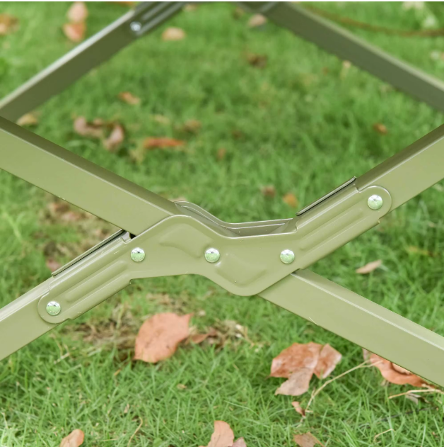 Fältsäng, tält, uppblåsbar madrass, uppblåsbar kudde och sovsäck. En färdig lösning utan extra tillbehör att köpa.