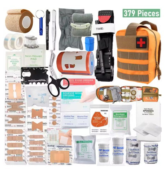 Ett omfattande men prisvärt kit med hela 379 delar – allt från plåster och sårtvätt till elastiska lindor, sax och kylpåse.