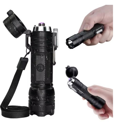 🔦🔥 Alltid ljus & eld – USB-laddad ficklampa med vindskyddad plasmatändare.