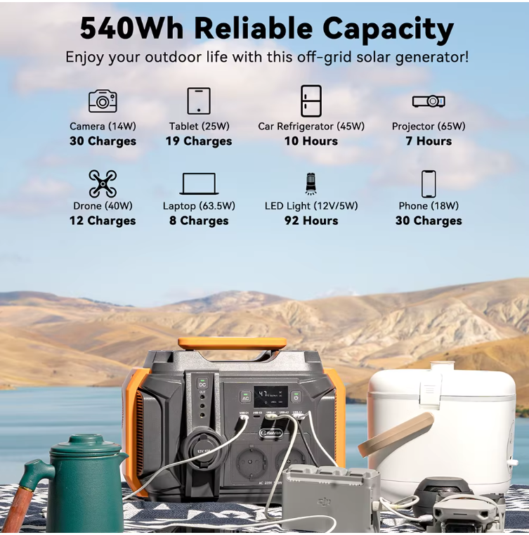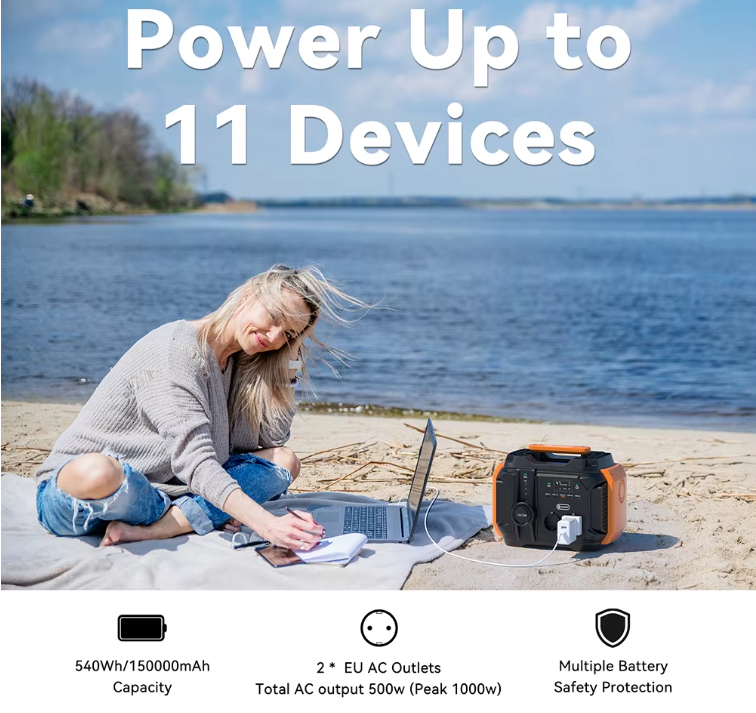 Med en kraftfull 540Wh Li-ion-batteribank, 500W ren sinusvåg, och en vikbar 100W solpanel, får du en komplett och driftsäker strömkälla som fungerar var som helst — oavsett om det är strömavbrott hemma eller camping i naturen.